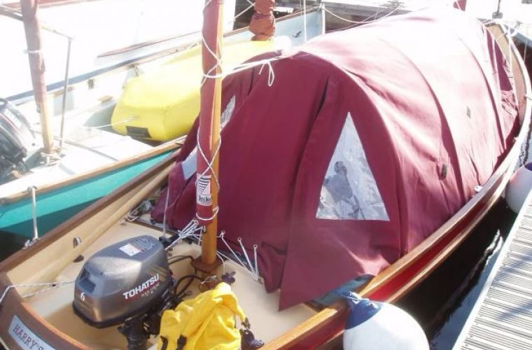 A full camping tent is available for the open boats (except the Dabber). It encloses the whole of the cockpit & is supported on a set of bendy poles (these are NOT included in the price). It has a collar that laces around the mast, sleeves for the poles & an opening back panel with Velcro closures.